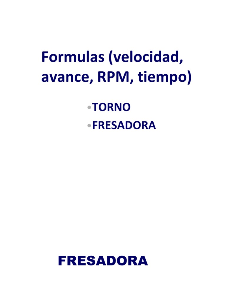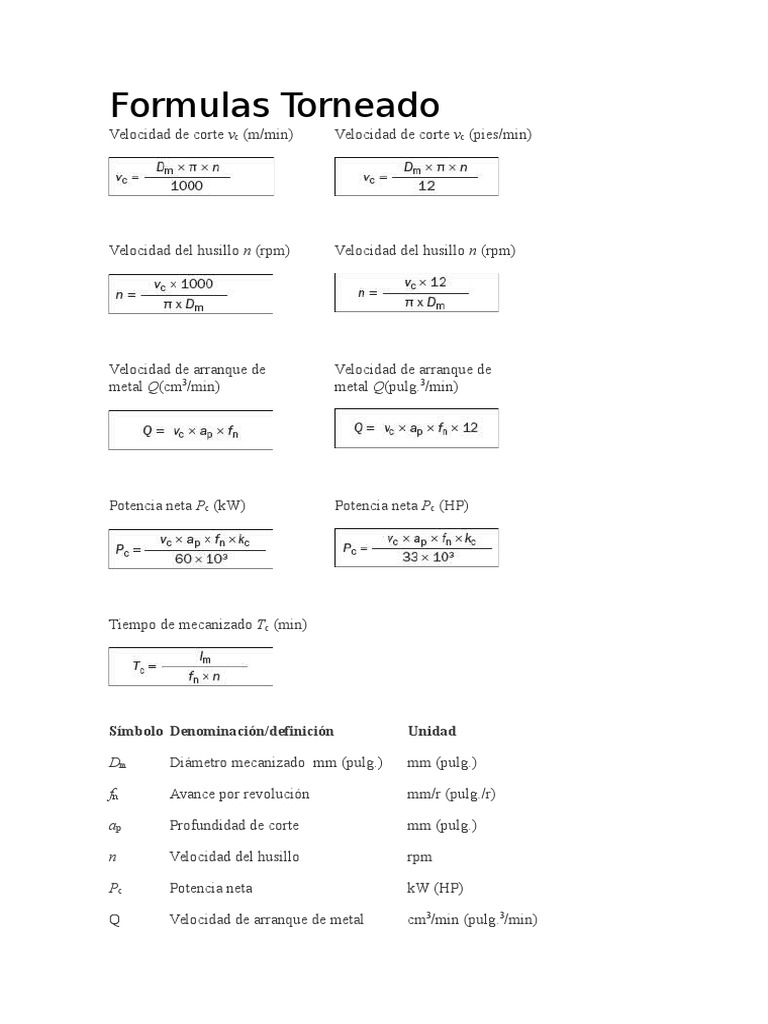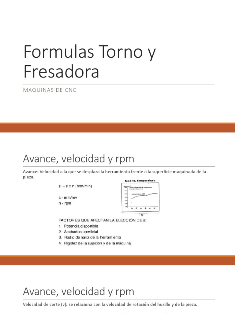 Velocidad de avance formula torno. Es por esto necesario conocer la velocidad de corte. Básicamente es la velocidad con la que la pieza de trabajo es cortada por la herramienta de corte es decir la velocidad con la que la cuchilla recorre la circunferencia de la pieza velocidad tangencial y por lo tanto se trata de una velocidad lineal que depende de la velocidad de giro de la pieza mecanizada o si se quiere entender como velocidad angular. La velocidad de. La velocidad de corte se expresa en pies o en metros por minuto.